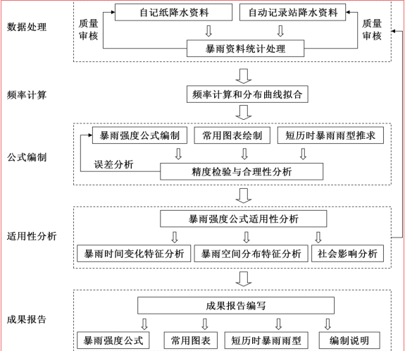 呼和浩特市暴雨強度公式編制的主要內容包括資料處理、單一重現期暴雨強度公式擬合、區間參數公式擬合、暴雨強度總公式擬合、常用查算圖表編制、精度檢驗、各強度暴雨時間變化特征和暴雨強度空間分布特征分析等內容,具體流程如下: